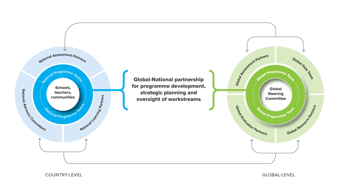 At the global level, our technical partners coordinate and synergise the innovation, research and evidence from across our ten countries. In addition, we are supported by a consortium of donors who work in coordination to ensure Schools2030 is equipped with financial resources, cross-sector expertise, and can leverage the influence and networks of each partner to expand our impact.
