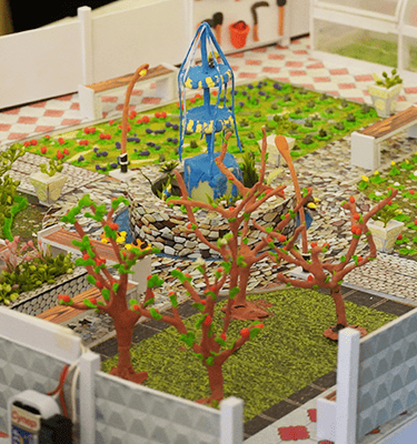 The lesson uses a variety of methods for exploring nature, including areas for planting fruit trees, decorative flowers, a pond, a greenhouse and a walking path.